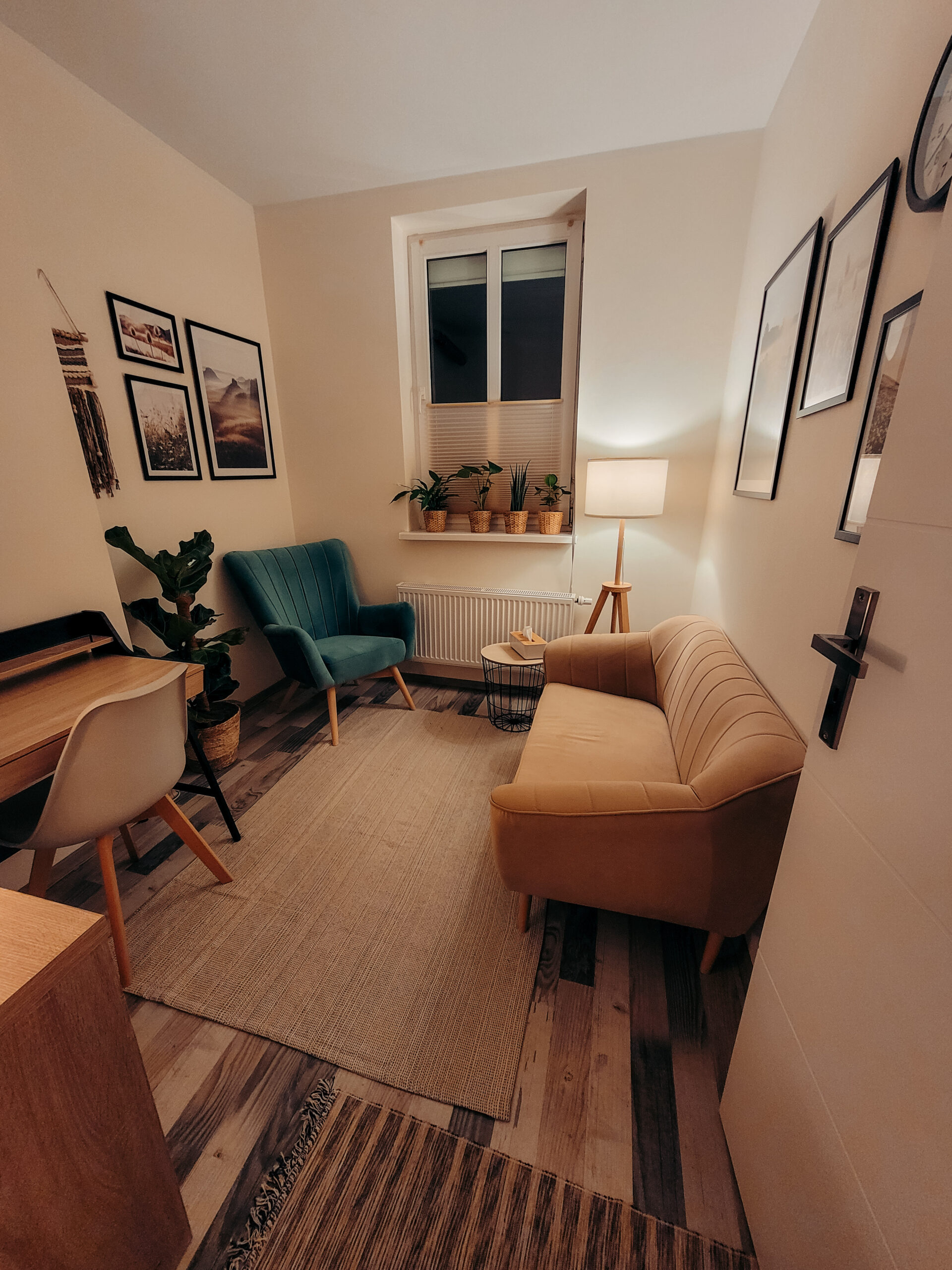 Przytulny wystrój sprzyja budowaniu przyjemnej i bezpiecznej atmosfery, a dogodna lokalizacja ułatwia dotarcie na miejsce. Do dyspozycji pacjentów pozostają darmowe miejsca parkingowe na terenie posesji. Możliwe jest także dotarcie do gabinetu komunikacją miejską. W pobliżu (ok. 10 minut spaceru) znajdują się przystanki linii: